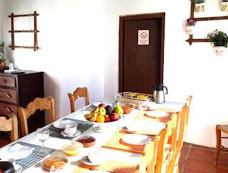 - Comedor antiguo con techo de madera y adornado con utensilios de labranza.